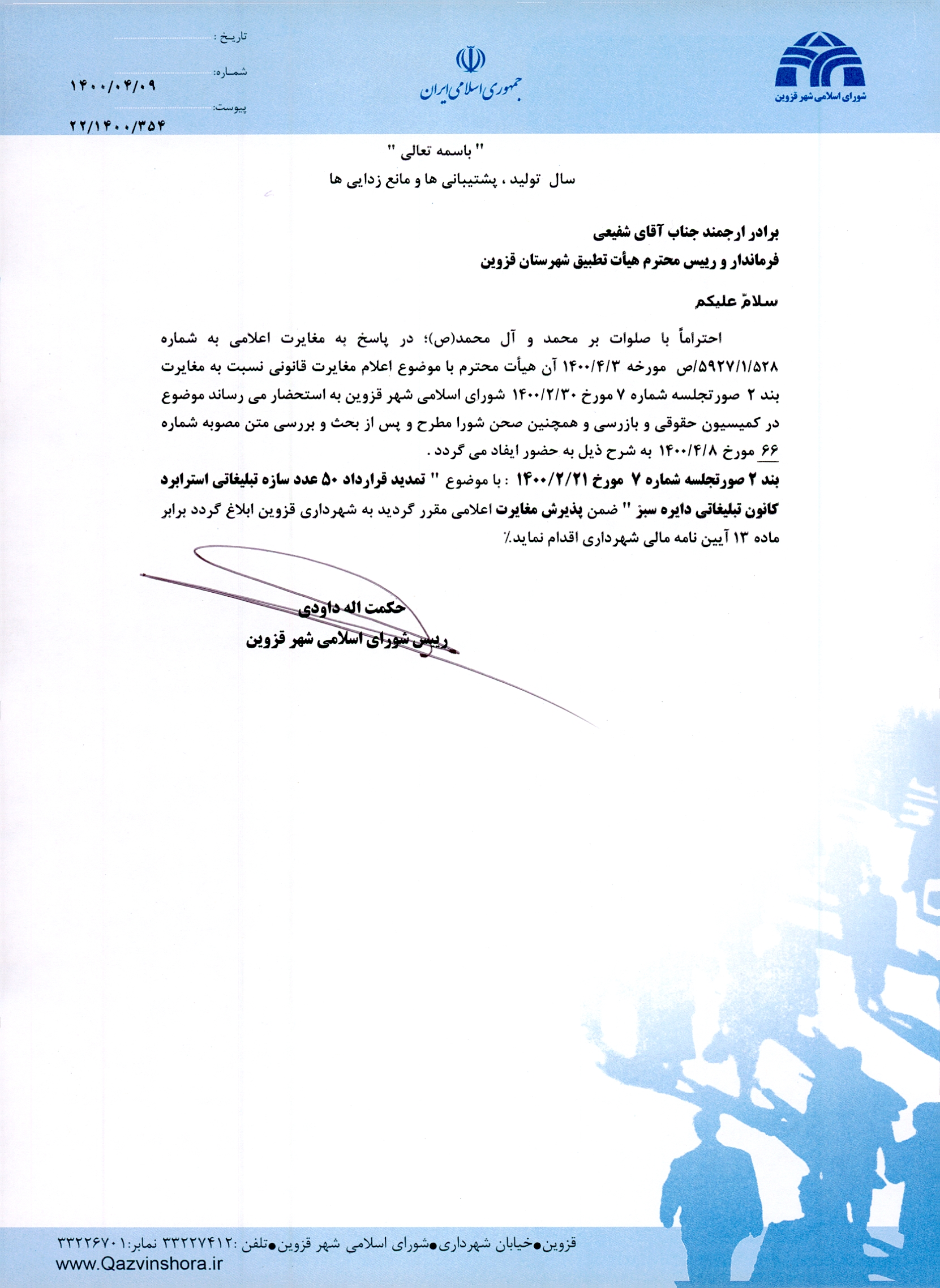 | اعلام مغایرت واگذاری پروژه موسوم به ستاره پونک جهت تسویه بدهی ودیون شهرداری به بانک شهر1400/4/8 | ||