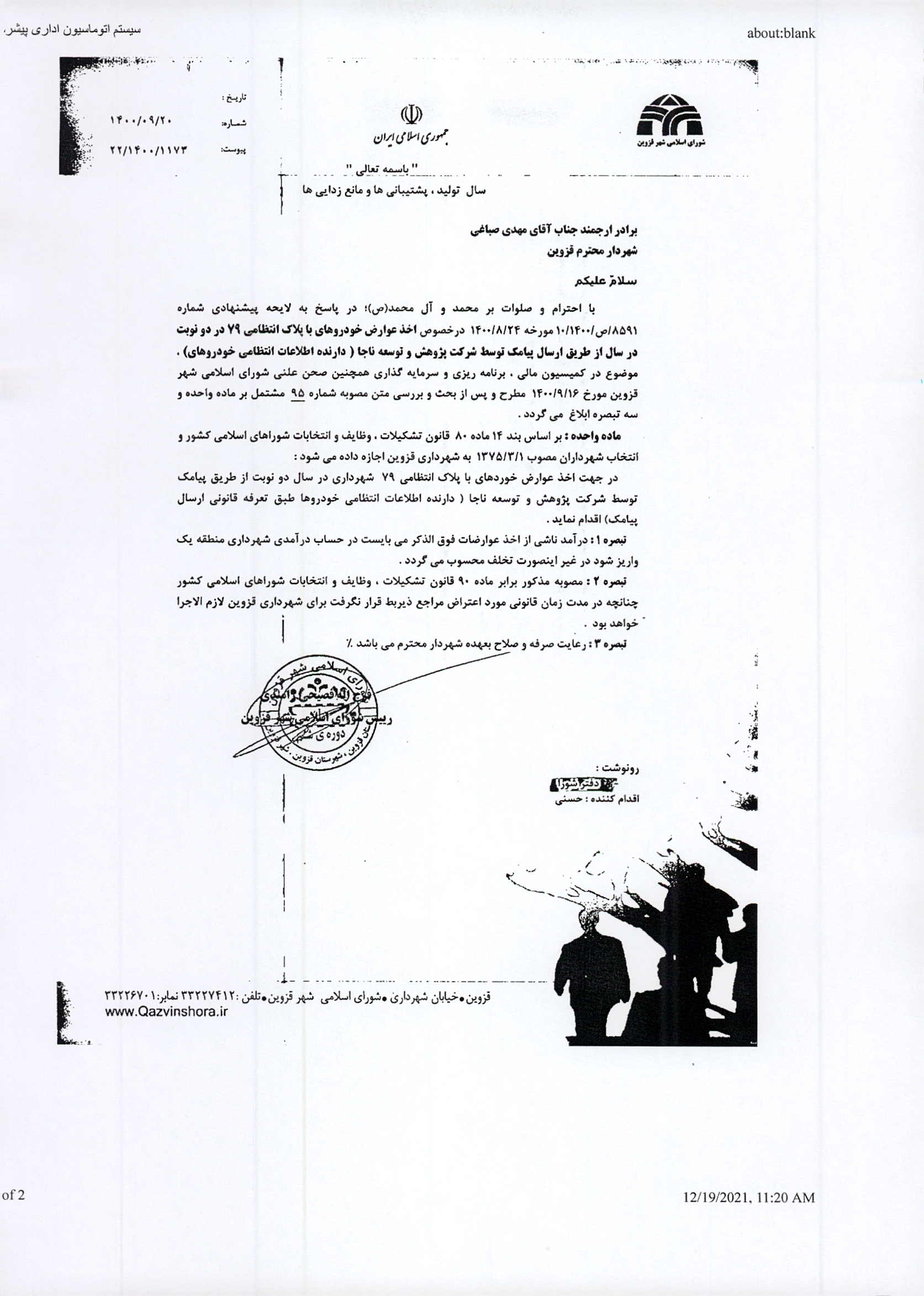 | | اخذ عوارض خودروهای پلاک انتظامی در دو نوبت در سال 1400/9/16 | |